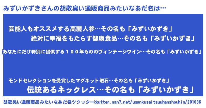 | 男性向けラノベタイトル風あだ名 | 『みずいかずきに滅ぼされるだけの簡単なお仕事です』 |