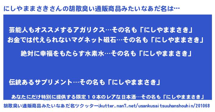 | ヘコむあだ名 | 『にしやままさき(震え声)』『にしっ子』 |