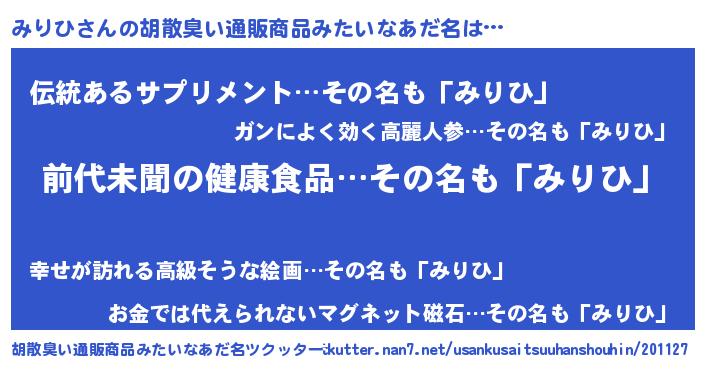 | ヘコむあだ名 | 『みりひ(苦笑)』『みり太郎』『豆乳』 |