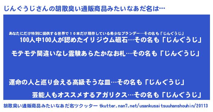 | 男性向けラノベタイトル風あだ名 | 『ジングウジアートオンライン』 |