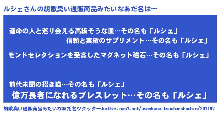 | ヒーロー風カッコイイあだ名 | 『天空の使者ルシェ』『スーパールシェ』 |