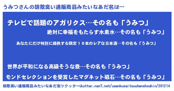 | 男性向けラノベタイトル風あだ名 | 『この素晴らしい世界にうみつを!』 |