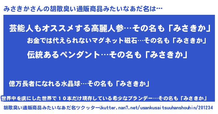 | 男性向けラノベタイトル風あだ名 | 『みさきかの嫁は女の子じゃないと思った?』 |