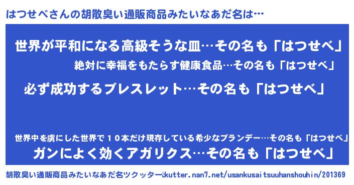 | 男性向けラノベタイトル風あだ名 | 『はつせべの憂鬱』『緋弾のハツセベ』 |