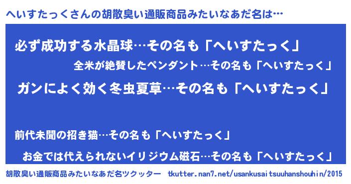 | 意味不明あだ名 | 『自称へいすたっく』 |