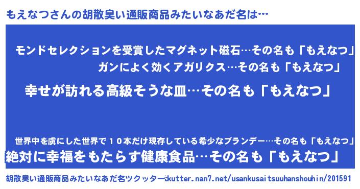 | 男性向けラノベタイトル風あだ名 | 『やはりもえなつの青春ラブコメはまちがっている 』 |