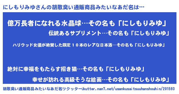 | 意味不明あだ名 | 『住所不定無職にしもりみゆ(68歳)』 |