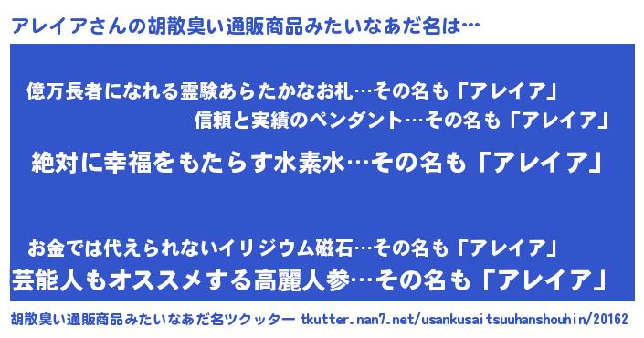 | 意味不明あだ名 | 『永久保存アレイア』『ペロリンアレイア』 |