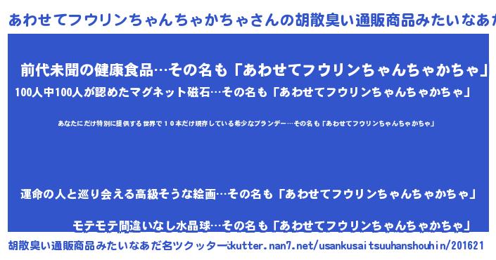 | 意味不明あだ名 | 『住所不定無職あわせてフウリンちゃんちゃかちゃ(77歳)』 |