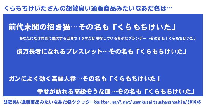 | 男性向けラノベタイトル風あだ名 | 『くらもちけいたに滅ぼされるだけの簡単なお仕事です』 |