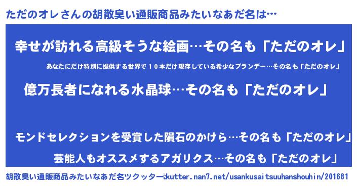 | 男性向けラノベタイトル風あだ名 | 『タダノオレアートオンライン』 |