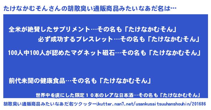 | 男性向けラノベタイトル風あだ名 | 『おまえをオタクにしてやるから、俺をたけなかむそんにしてくれ! 』 |