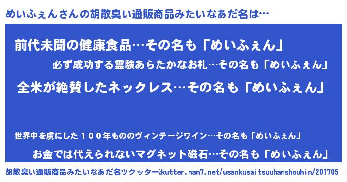 | ヘコむあだ名 | 『めい太郎』『めいふぇん(笑)』 |