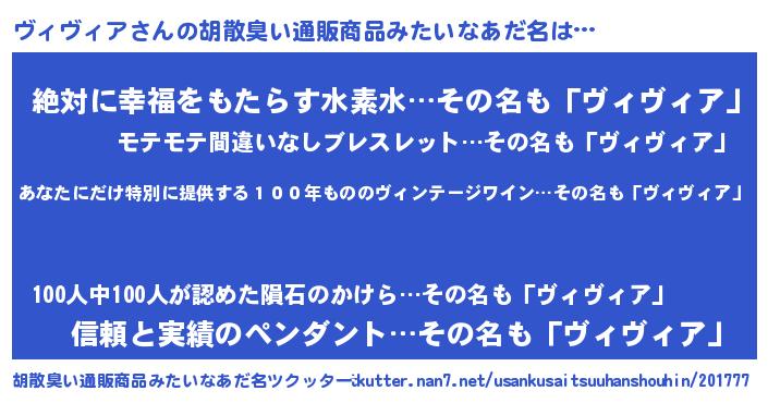 | 男性向けラノベタイトル風あだ名 | 『ヴィヴィア~年齢イコール彼女いない歴の魔法使い~』 |