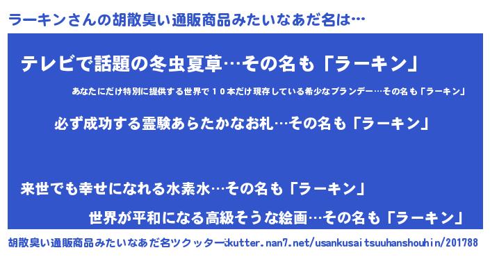 | 意味不明あだ名 | 『ペロリンラーキン』『自称ラーキン』 |