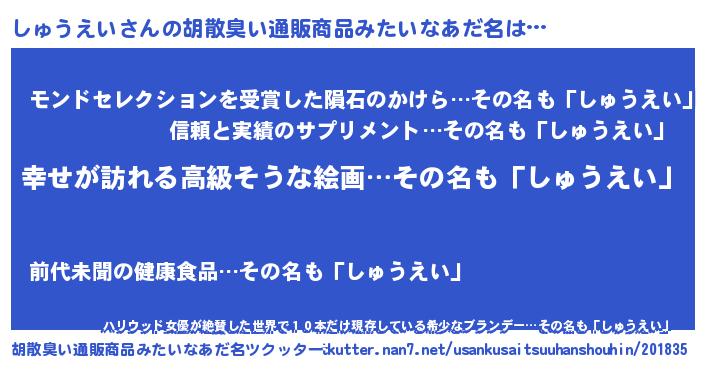 | 男性向けラノベタイトル風あだ名 | 『シュウエイスレイヤー』 |
