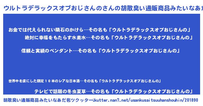 | 男性向けラノベタイトル風あだ名 | 『ダンジョンにウルトラデラックスオブおじさんのを求めるのは間違っているだろうか』 |