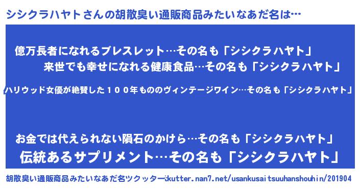 | 意味不明あだ名 | 『住所不定無職シシクラハヤト(5歳)』 |