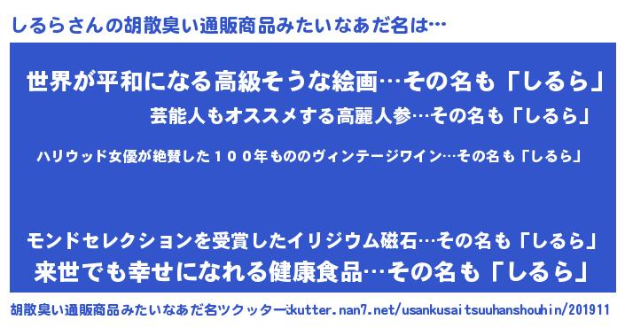 | 意味不明あだ名 | 『めかぶ科しるら属』『永久保存しるら』 |