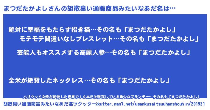 | ヘコむあだ名 | 『まつだたかよし(笑)』『まつにー』 |
