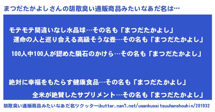 | 男性向けラノベタイトル風あだ名 | 『おまえをオタクにしてやるから、俺をまつだたかよしにしてくれ! 』 |