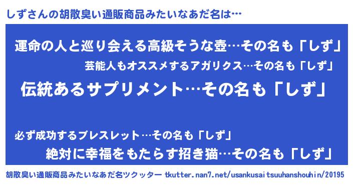 | ヒーロー風カッコイイあだ名 | 『銀牙騎士シズ』『ウルトラしずマン』 |