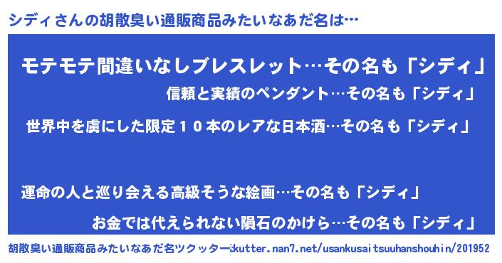 | 意味不明あだ名 | 『住所不定無職シディ(43歳)』 |