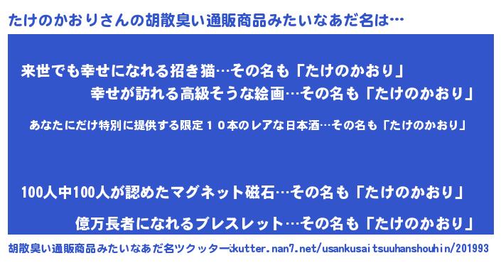| ヘコむあだ名 | 『たけのかおり(笑)』『たけふぇ~』 |