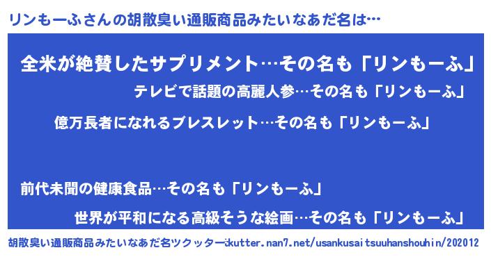 | 男性向けラノベタイトル風あだ名 | 『リンもーふ~年齢イコール彼女いない歴の魔法使い~』 |
