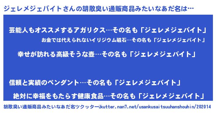| 女子向けラノベタイトル風あだ名 | 『ジェレメジェバイトの雑貨屋さん』 |