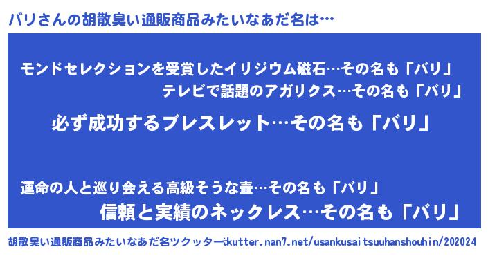 バリさんの胡散臭い通販商品みたいなあだ名をツクッター!