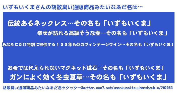 | 意味不明あだ名 | 『住所不定無職いずもいくま(12歳)』 |