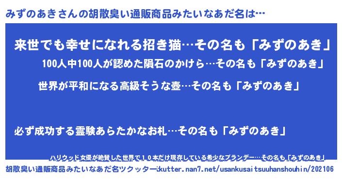| 男性向けラノベタイトル風あだ名 | 『転生したらみずのあきだった件』 |