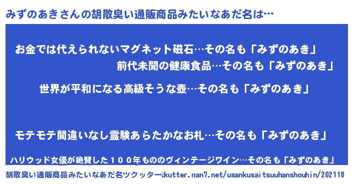| 肩書あだ名 | 『みずのあき大尉』『みずのあき総理大臣』 |