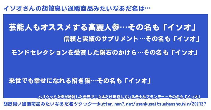| ヒーロー風カッコイイあだ名 | 『慈愛の使者イソオ』『究極戦士イソオ』 |