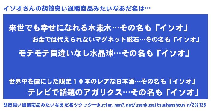 | ヘコむあだ名 | 『イソもー』『イソオ(笑)』『豆乳』 |