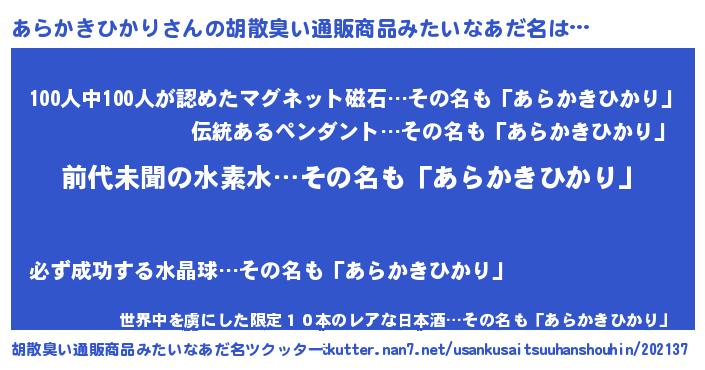 | ヘコむあだ名 | 『あらかきひかり(震え声)』『あら太郎』 |
