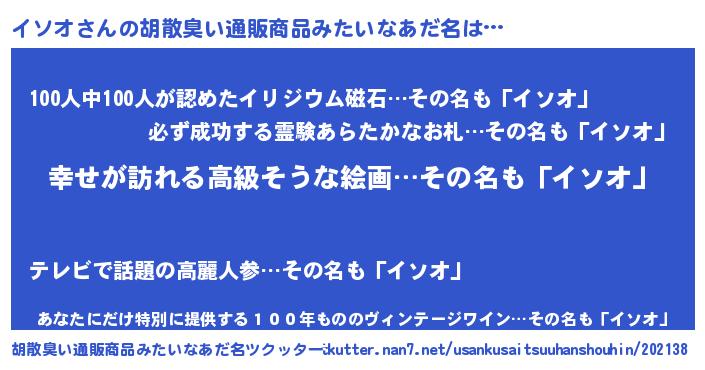 | 欧米人風あだ名 | 『イソオクリステル』『ダニエルイソオ』 |