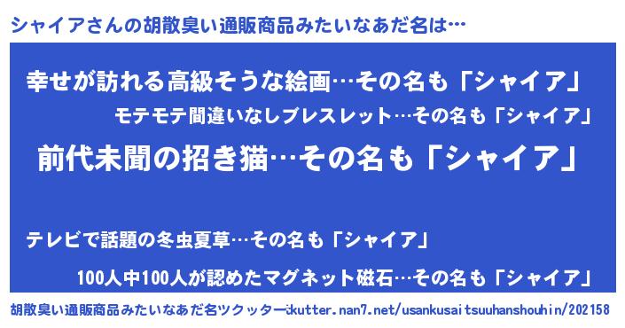 | 意味不明あだ名 | 『永久保存シャイア』『ペロリンシャイア』 |