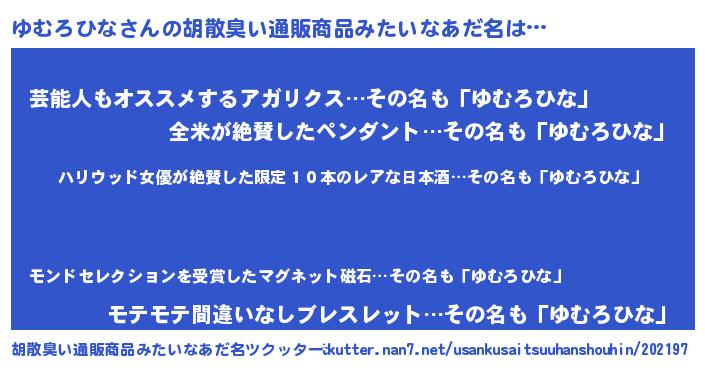 | 意味不明あだ名 | 『住所不定無職ゆむろひな(68歳)』 |
