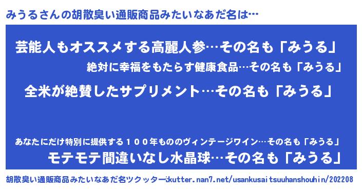 | 男性向けラノベタイトル風あだ名 | 『みうるの嫁は女の子じゃないと思った?』 |