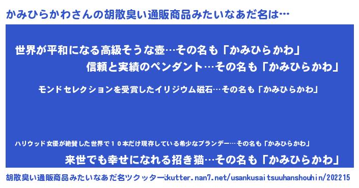 | ヘコむあだ名 | 『酢こんぶ』『かみひらかわ(爆)』 |