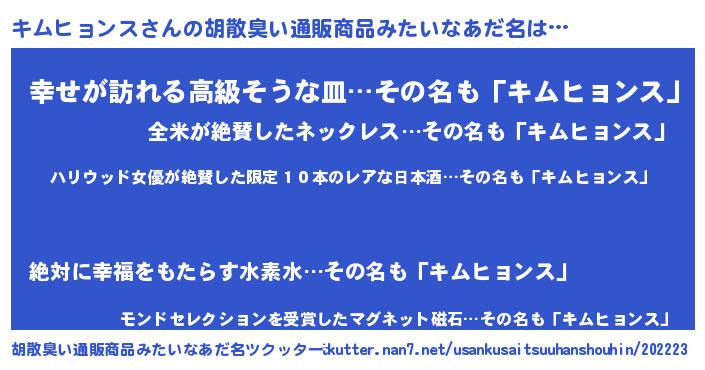 | 男性向けラノベタイトル風あだ名 | 『キムヒョンススレイヤー』 |