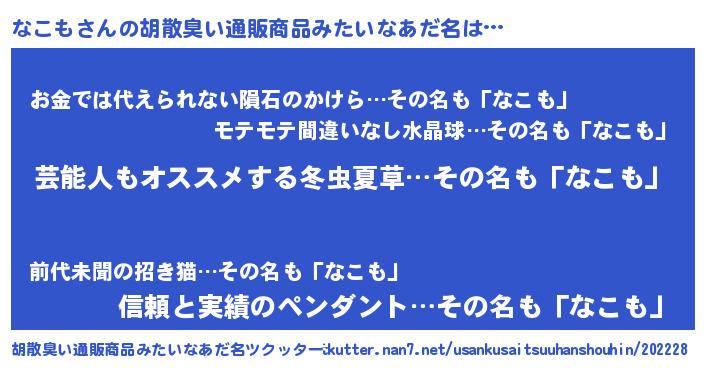| 男性向けラノベタイトル風あだ名 | 『Re:なこもから始める異世界生活』 |