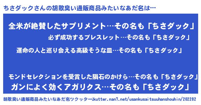 | 男性向けラノベタイトル風あだ名 | 『うちのちさダックが世界を掌握している!』 |