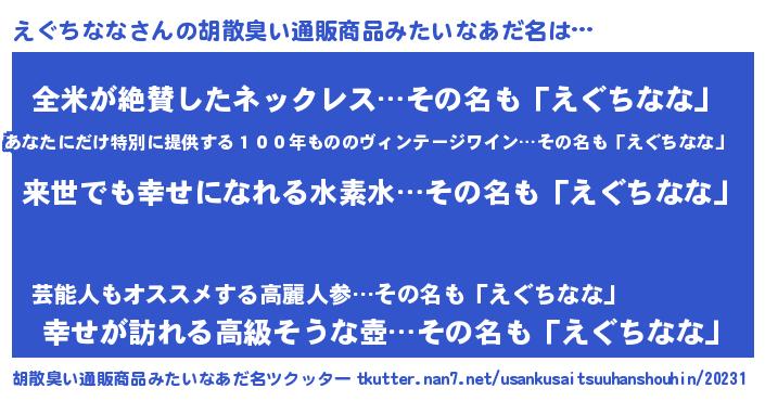 | 意味不明あだ名 | 『永久保存えぐちなな』『自称えぐちなな』 |