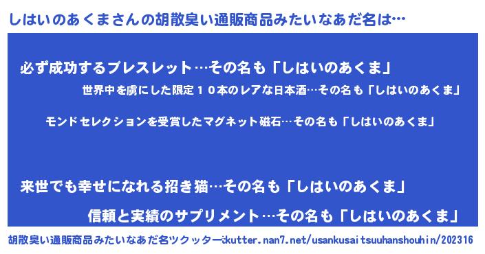 | 男性向けラノベタイトル風あだ名 | 『うちのしはいのあくまが世界を掌握している!』 |