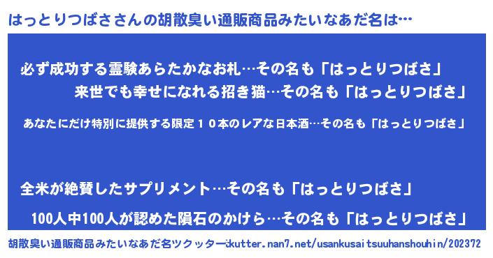 | 男性向けラノベタイトル風あだ名 | 『この素晴らしい世界にはっとりつばさを!』 |