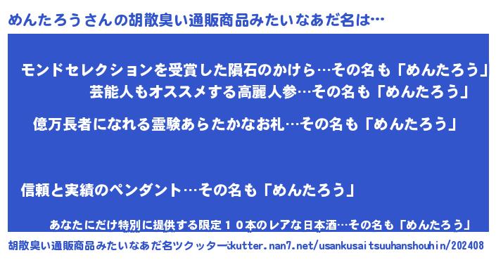 | 意味不明あだ名 | 『ペロリンめんたろう』『自称めんたろう』 |