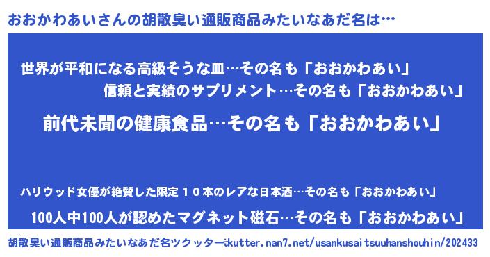 | ヘコむあだ名 | 『おおかわあい(苦笑)』『なまこ酢』 |